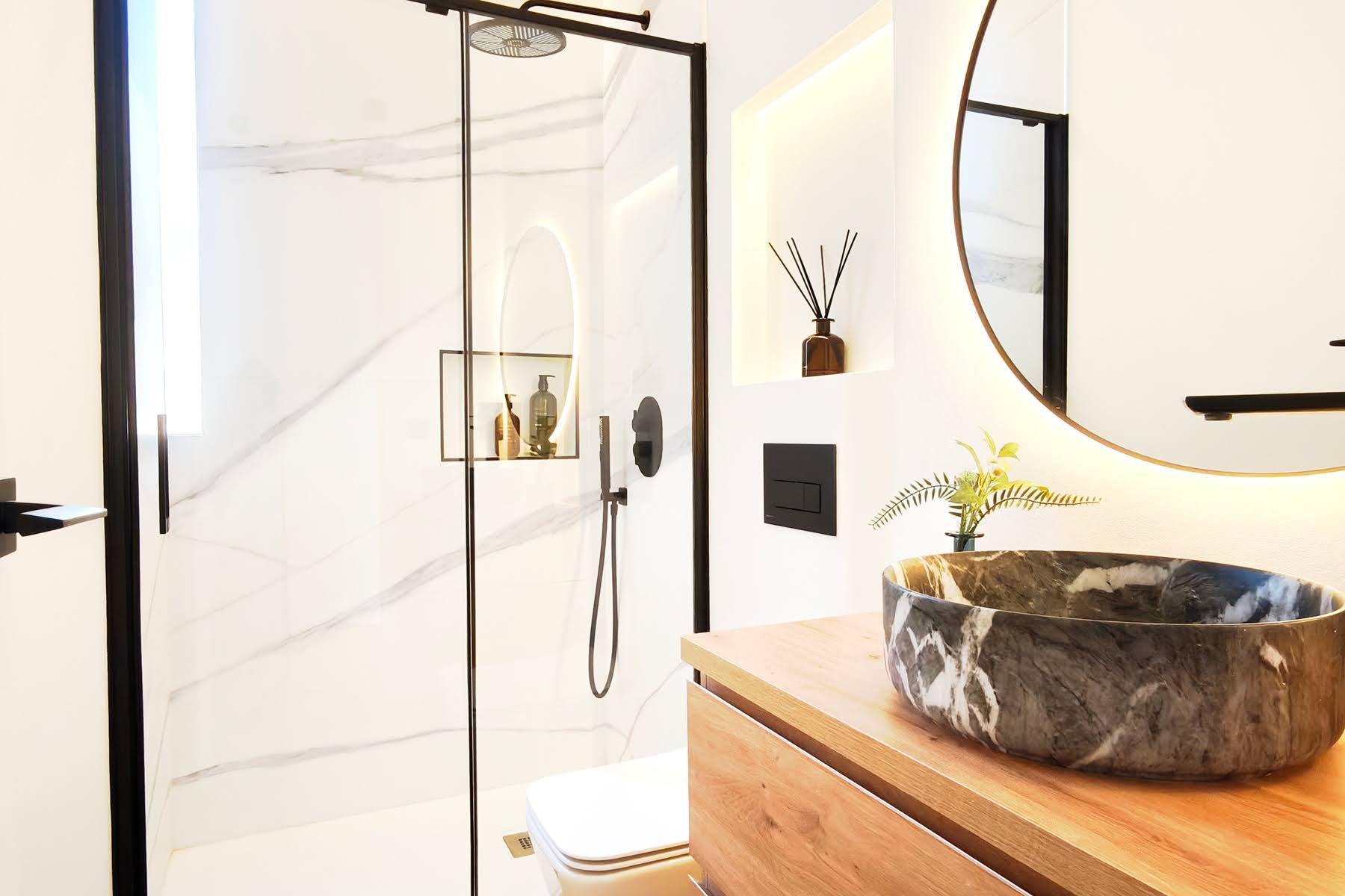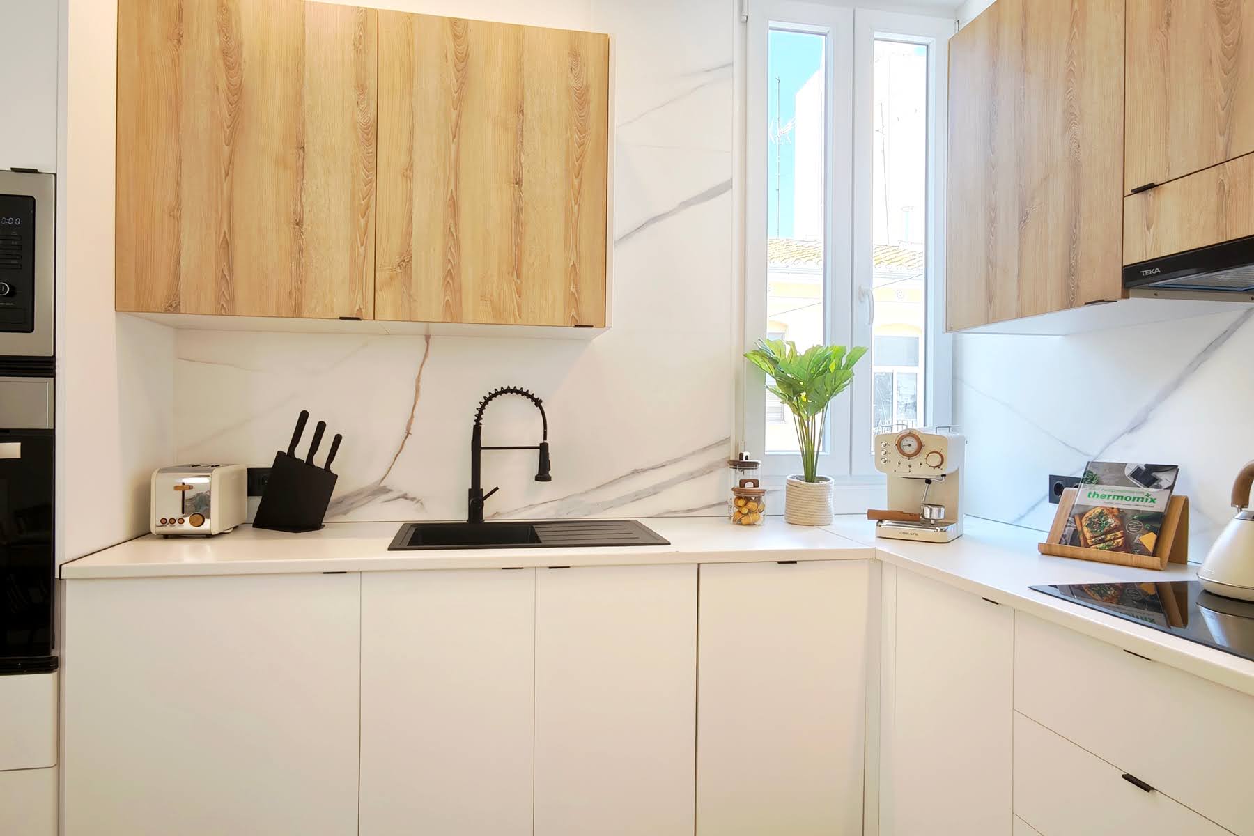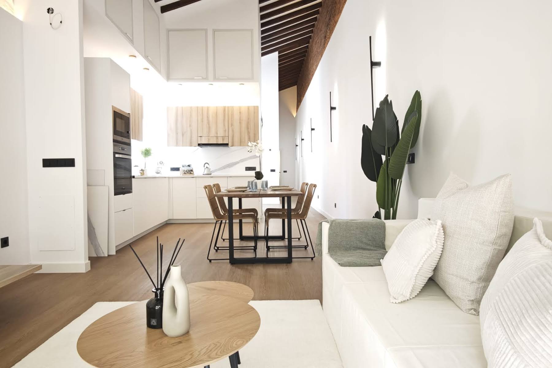 Se demuele la escalera existente y se ejecuta una nueva estructura metálica, se renuevan fachada y carpinterías y se reconstruye por completo el interior. Se redefine la distribución con tres habitaciones, cocina abierta y baños nuevos, poniendo en valor la altura original y las vigas de madera vistas mediante una iluminación cuidada.